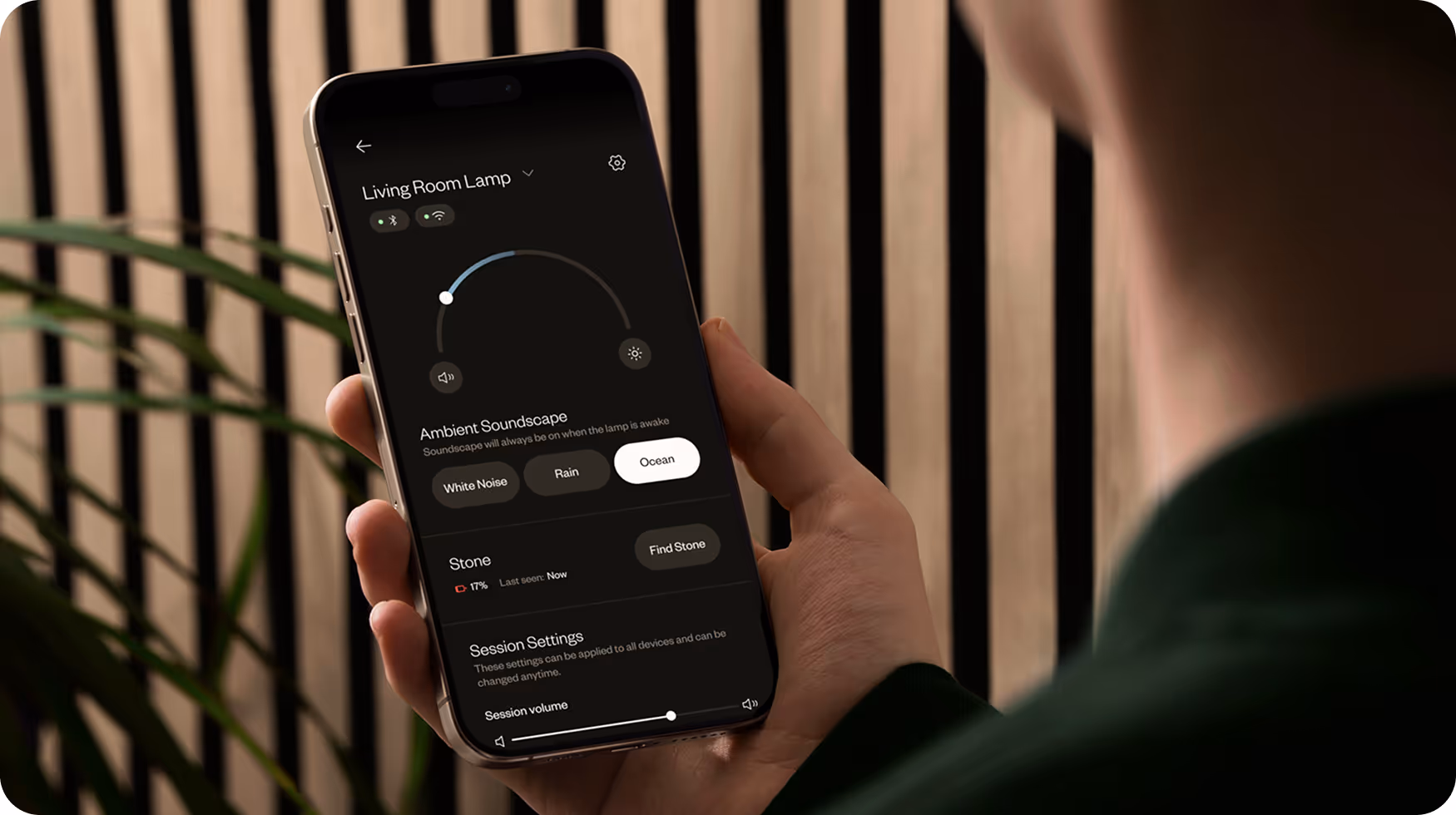 The stone tracks your body’s rhythm using biometric sensors, guiding you toward your ideal breathing rhythm with subtle pulses you can feel. When not in use, it nests in the lamp’s halo and controls its light and ambient soundscape.